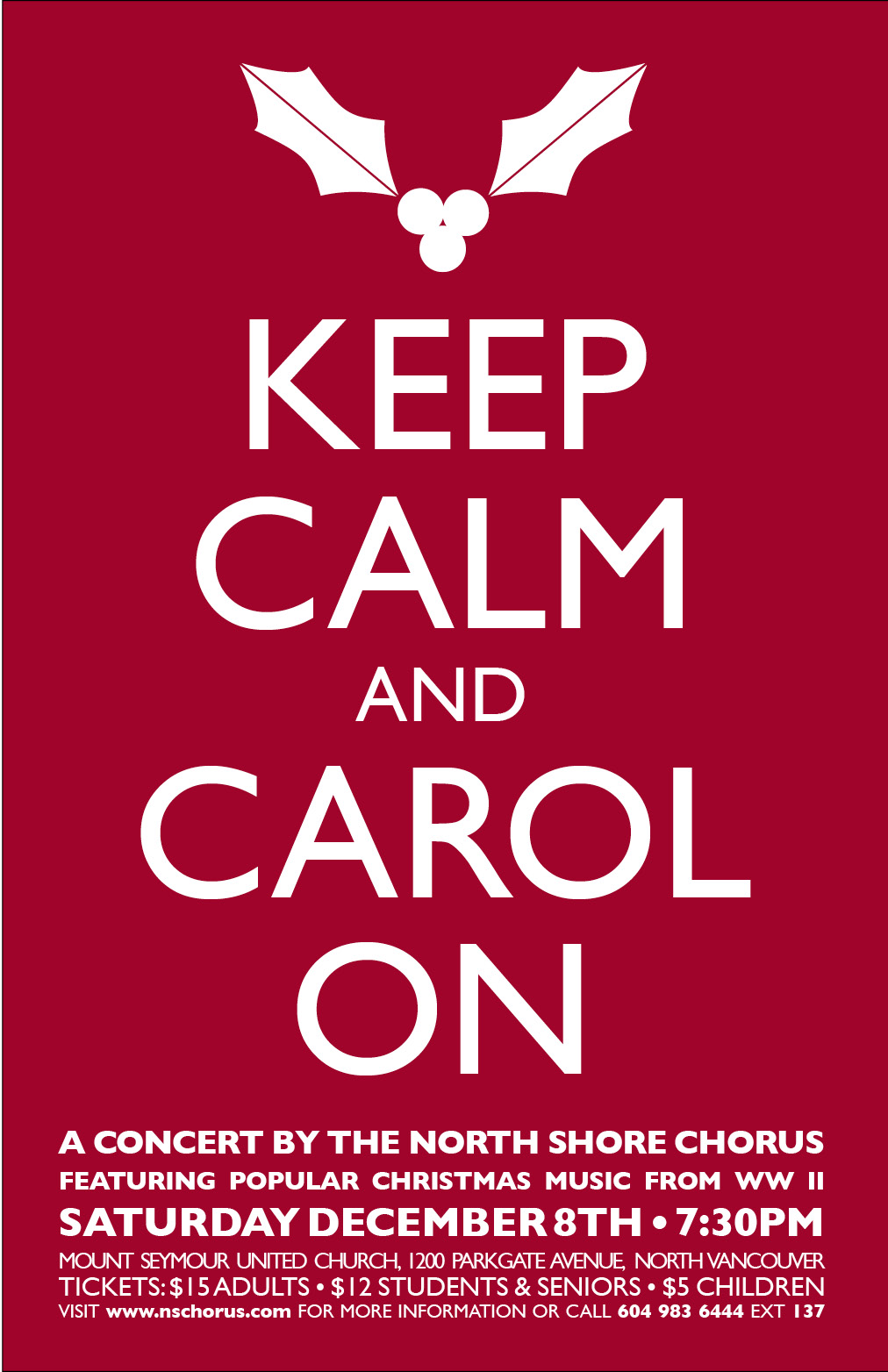 Keep Calm & Carol On Poster ← Previous Next → Concert poster for the North Shore Chorus, winter 2013.